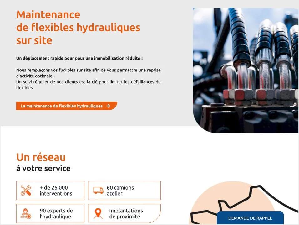 Spécialiste du dépannage de flexibles hydrauliques sur site 24/7 et évoluant dans un secteur très concurrentiel, l'entreprise devait rapidement développer son image de marque et s'assurer de la meilleure visibilité sur les moteurs de recherche.
