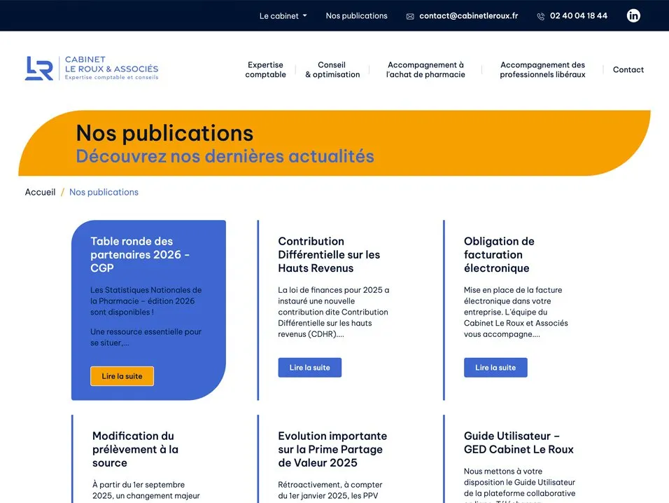 Le Cabinet Le Roux ne disposait d’aucun site internet, ce qui limitait fortement sa visibilité en ligne et sa capacité à générer de nouvelles opportunités. Historiquement reconnu pour son expertise auprès des pharmaciens, le cabinet faisait également face à une perception trop restrictive de son positionnement.
