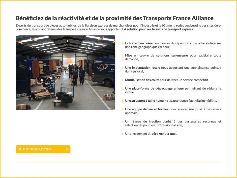 Le réseau des Transports France Alliance est spécialisé dans le transport express de marchandises et est implanté dans 19 départements du Grand-Ouest.