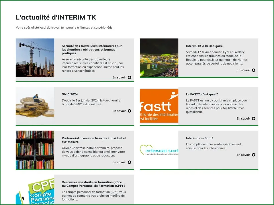Notre équipe a conçu un web design reprenant la charte graphique de l'entreprise. Compatible mobile, elle met en avant les dernières offres d'emploi publiées. Côté back-office, notre solution de gestion de contenu, intuitive et optimisée pour le référencement Google permet une administration aisée du site web.
