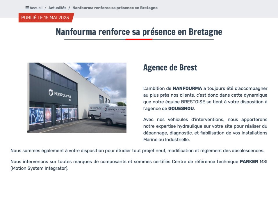 Expert hydraulique et centre certifié Parker, basé à Saint-Herblain près de Nantes, Nanfourma nous avait confié la création de son précédent site en 2013.