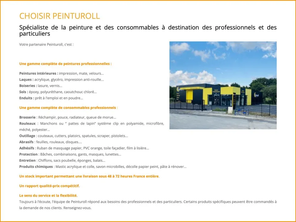 Peinturoll est spécialisée dans la vente de peintures (intérieures, façades, boiseries, laques, sols, enduits...) et consommables (brosserie, rouleaux, outillage, abrasifs, adhésifs, protection, entretien…). Peinturoll cible les professionnels et les particuliers et intervient en France entière.